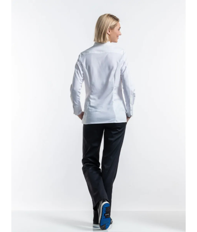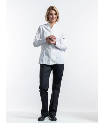 Cette veste de chef pour femme allie coupe élégante et confort.