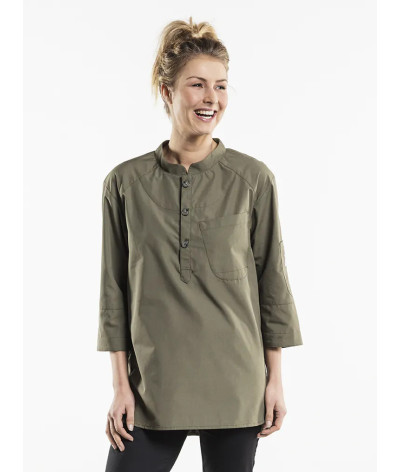 La Bujutsu se distingue par sa fermeture pullover, sa poche poitrine asymétrique et sa coupe ajustée.