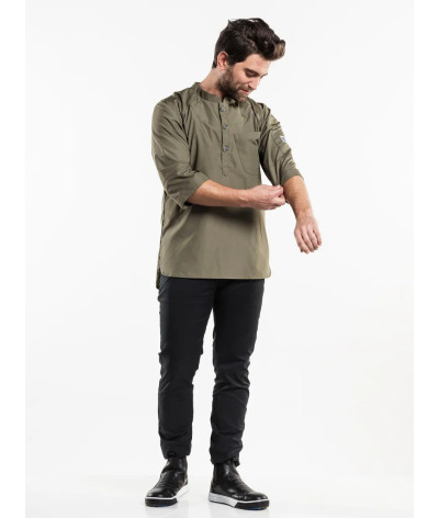 Découvrez la veste de cuisine mixte Bujutsu vert olive, une pièce unique qui bouscule les codes des vêtements professionnels traditionnels. Moderne, amusante et pleine de caractère, cette veste de cuisinier se distingue par sa coupe ajustée et sa fermeture pullover originale : ici, pas de boutons ! On l’enfile par la tête pour un look tendance et une grande liberté de mouvement.