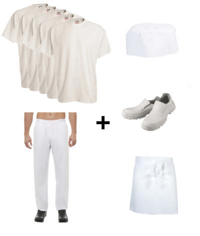 Tenue professionnelle de boulanger pour les élèves de la formation à distance Skill and You : Pantalon de cuisine blanc Americano, une paire de chaussures de sécurité modèle BONIX blanc, 1 calot en tissu blanc , 1 tablier demi chef Phoenix blanc , 5 tee-shirts blancs.
