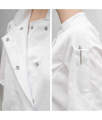 Cette veste de cuisine blanche à manches courtes pour femme est pratique avec sa poche stylo sur la manche gauche et sa poche intérieure coté droit.