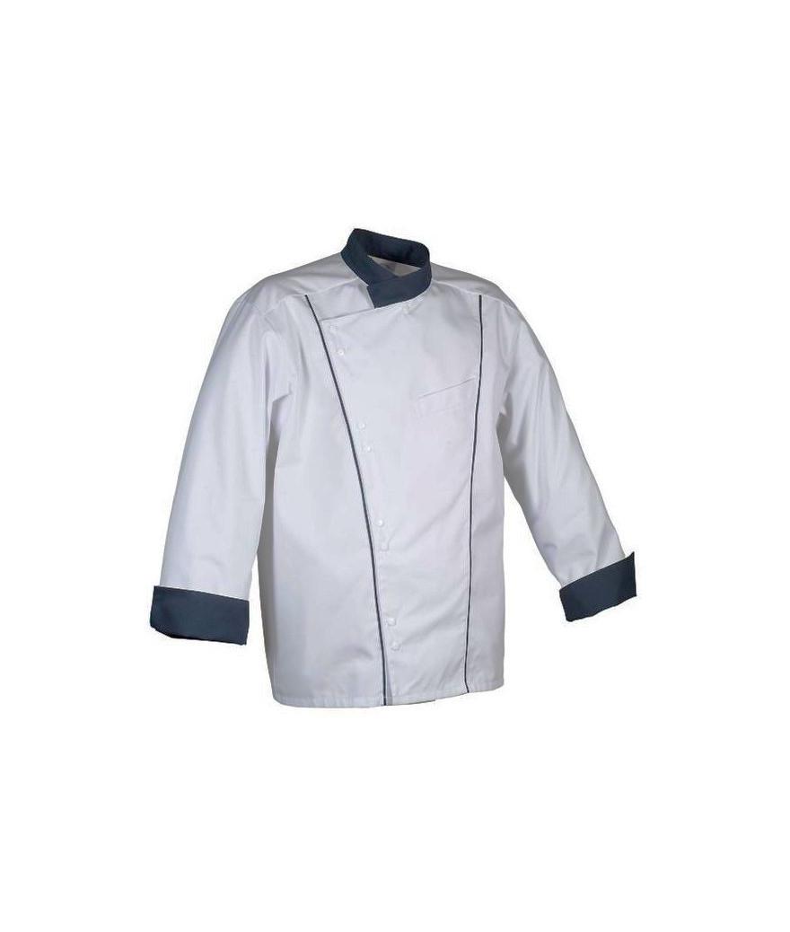 Veste de cuisine blanche avec parement gris, à manches longues. Son col officier et sa fermeture par boutons pressions lui apporte un confort que vous apprécierez. Cette veste de cuisine vous est proposée à un prix économique.